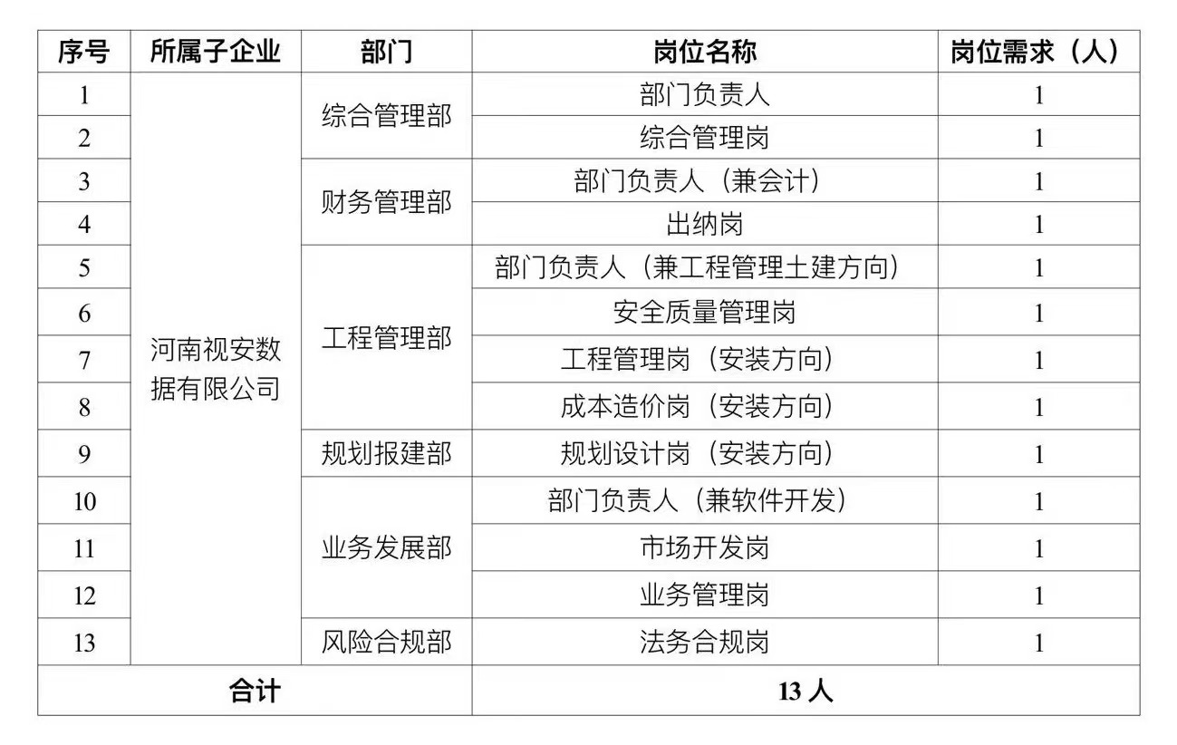 根據(jù)河南鐵建投物流有限公司工作計(jì)劃,為滿足河南視安數(shù)據(jù)有限公司項(xiàng)目建設(shè)運(yùn)營人才需求,確保數(shù)字物流綜合服務(wù)多式聯(lián)運(yùn)智慧樞紐項(xiàng)目建設(shè)、倉儲、信息化服務(wù)等高鐵物流業(yè)務(wù)順利實(shí)施?,F(xiàn)面向社會公開招聘13人,有關(guān)事宜公告如下:
